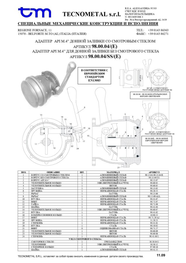 98.00.04/E Адаптер API с рычагом и смотровым глазком. EN 13083, ADR сертификат BUREAU VERITAS G7033/20/RP № BV 7361514 . Маркировка в соответствии с ДОПОГ, гарантия 24 месяца.