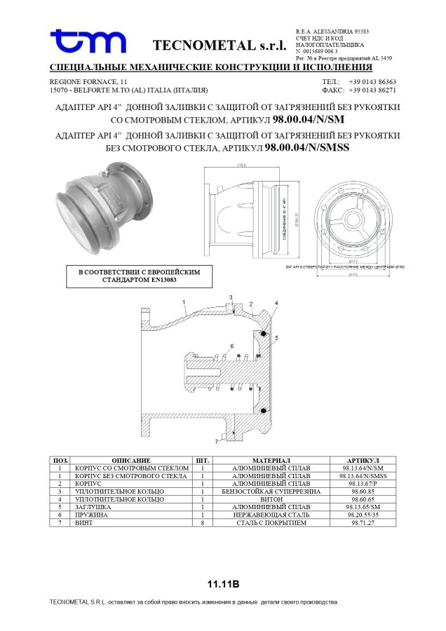 Адаптер для API 4" для нижнего налива противозагрязняющий без рукоятки и глазка, артикул: 98.00.04/SMSS/E