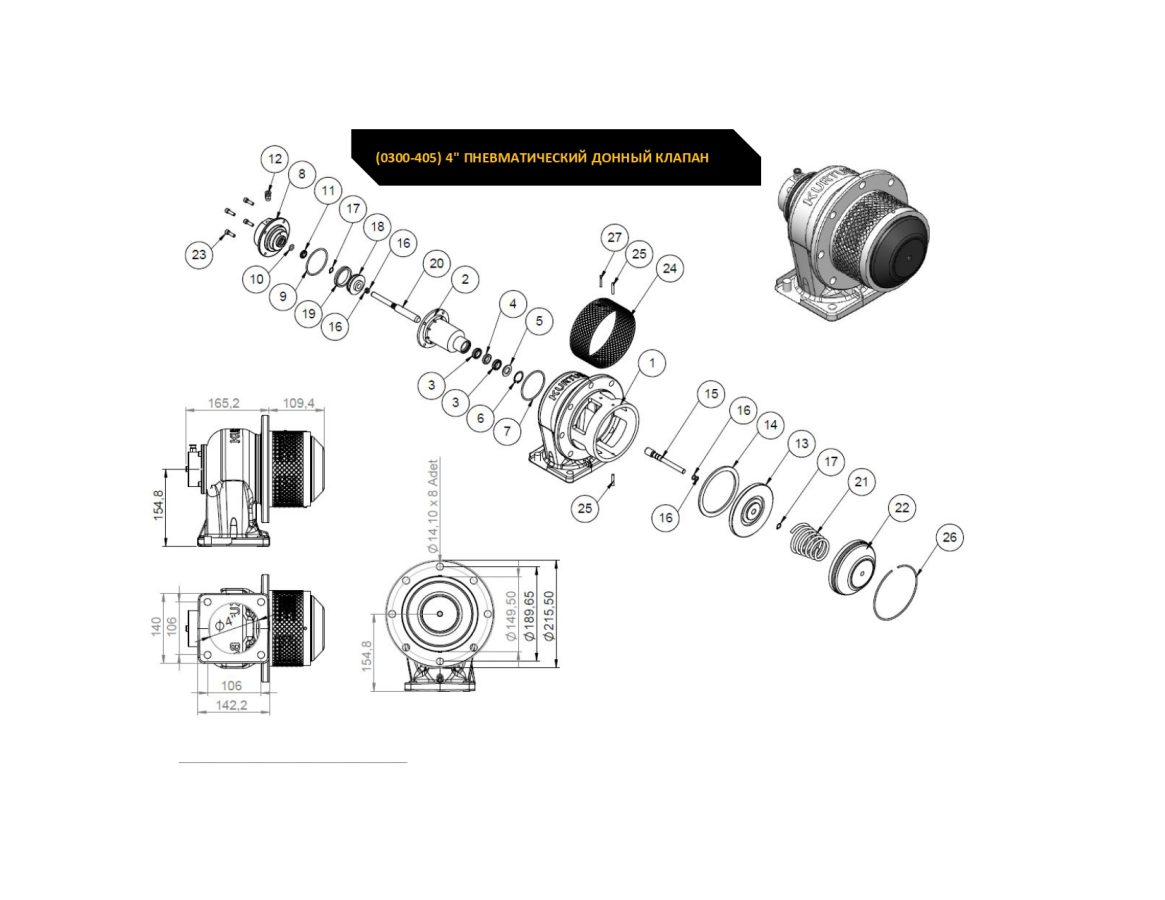 DN100 пневматический донный клапан (металлическая накладка), артикул: 0300-405