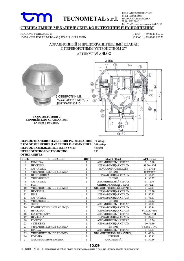 91.00.02 Предохранительный дыхательный клапан. EN 14595, ADR сертификат