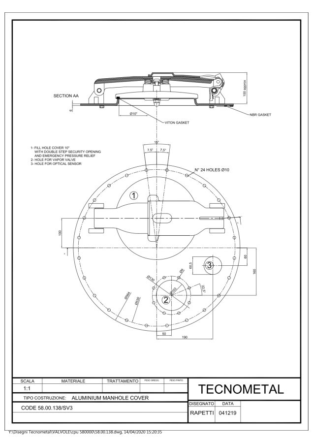 58.00.138 SV3 Крышка инспекционного люка. EN 13314, ADR сертификат BUREAU VERITAS G7071/19/RP № BV 7266965. EN 13317, ADR сертификат BUREAU VERITAS G4360/18/RP № BV 7218353. EN 14596, ADR сертификат BUREAU VERITAS G7075/19/RP № BV 7266965.