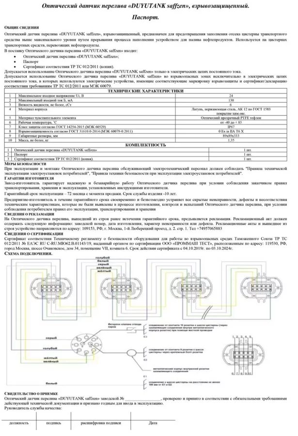 Оптический датчик переполнения DUYUTANK Saffzen™ предназначен для предотвращения переполнения отсеков цистерн транспортного средства. Используется на цистернах для перевозки нефтепродуктов. Система включает в себя оптический датчик переполнения, паспорт и сертификат соответствия требованиям ТР ТС 012/2011.
