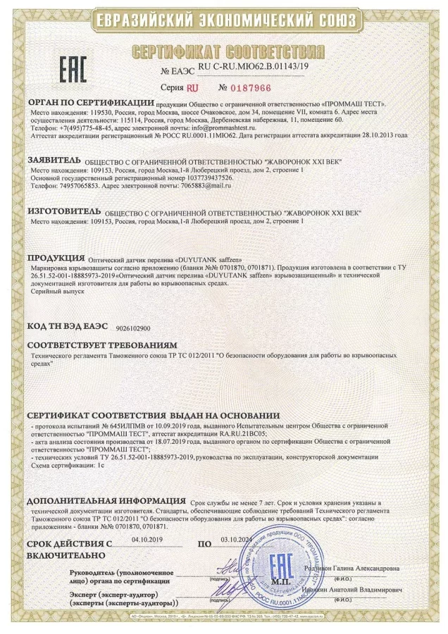 Сертификат соответствия требованиям ТР ТС 012/2011.