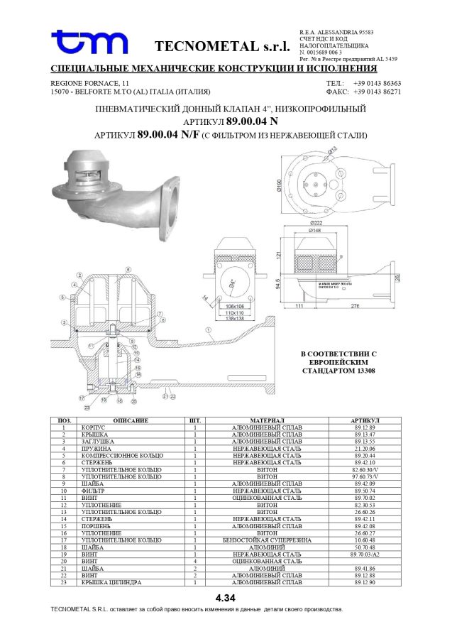 89.00.04 Пневматический донный клапан. EN 13308, ADR сертификат BUREAU VERITAS G7069/19/RP