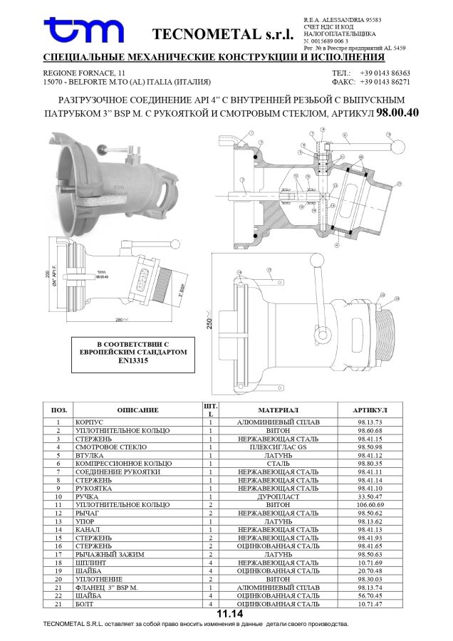 Разгрузочный переходник 4" для API с выпускным патрубком 3" с рычагом и глазком, артикул: 98.00.40